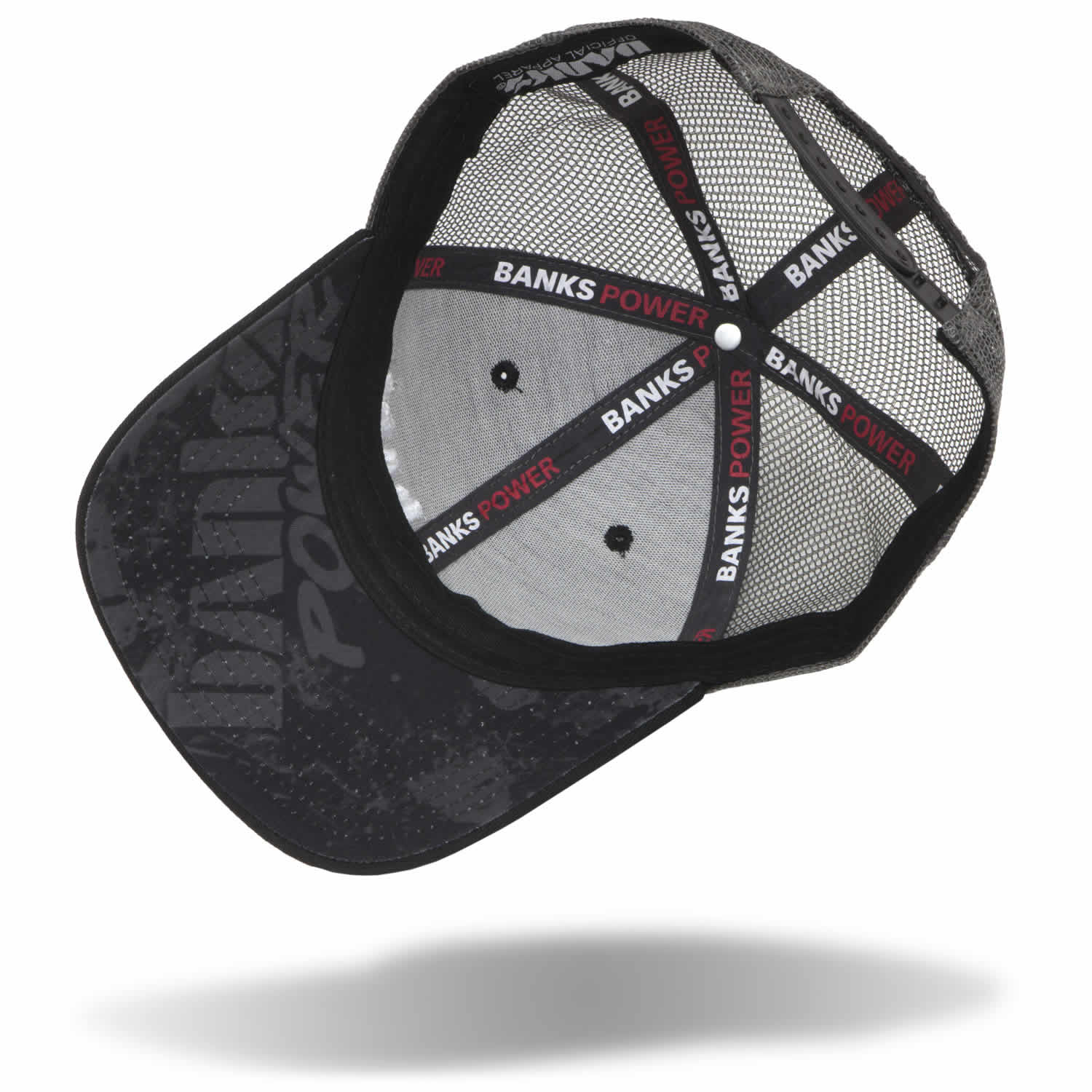Trucker mesh snap-back cap with Banks Power on front in red/white, US flag on side, and bankspower.com on back. One size fits most. Curved bill.